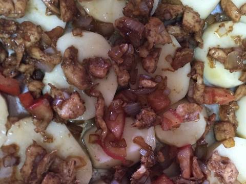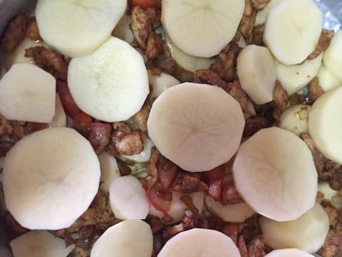 - تقطع البطاطس دوائر وترص في صينية الفرن فوق شرائح البصل والطماطم ثم خلطه الدجاج وتعمل كالتالي: